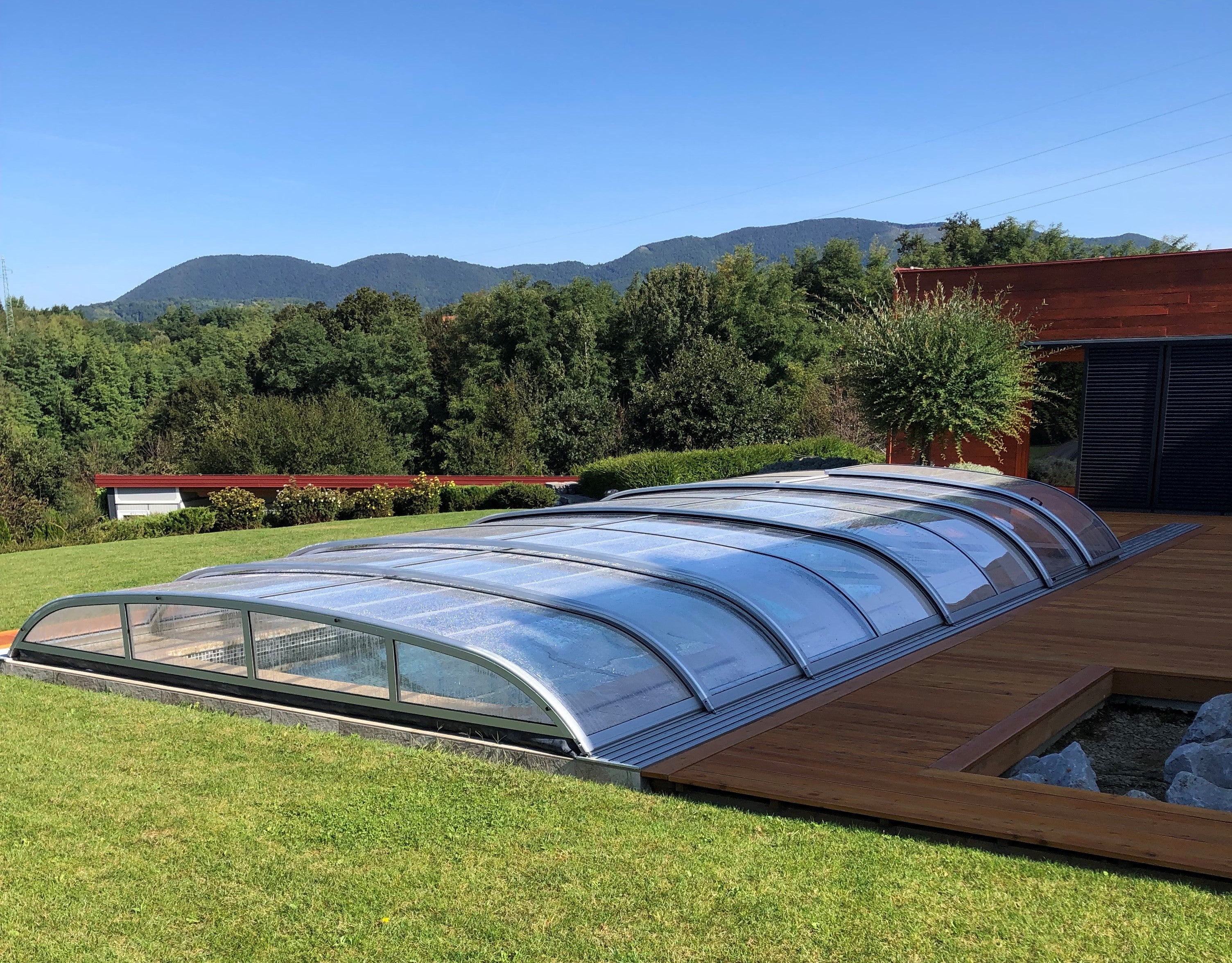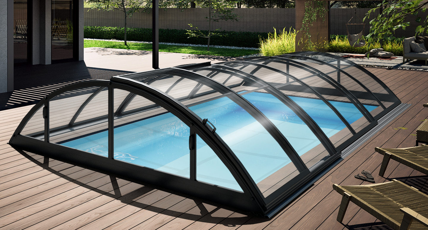 Detta låga pooltak kombinerar en tilltalande estetik med hög funktionalitet. Konstruktionen består av klarglas polykarbonatpaneler som möter elegant antracit pulverlackerade aluminiumprofiler. En betydande fördel med detta...